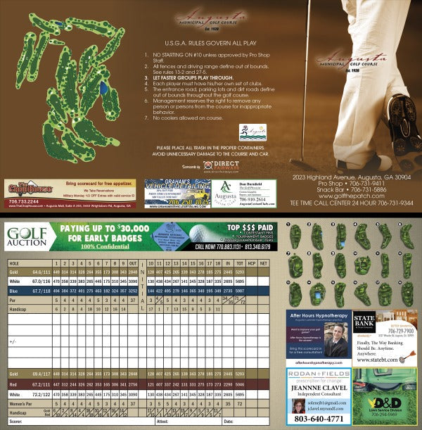 Save your course thousands of dollars with our cost-free, hassle-free scorecards. Top-quality doesn’t have to come with a high price tag! Our design team will work directly with you to customize your scorecard and ensure you are happy with the final product. In-house production allows us flexibility to accommodate golf course needs quickly and easily. Our scorecards are designed with your choice of individual hole pictorials or pin placement illustrations, an aerial course layout, rules of play, and an unlimited variety of color and font choices. And they are always free for your course, from start to finish to delivery.